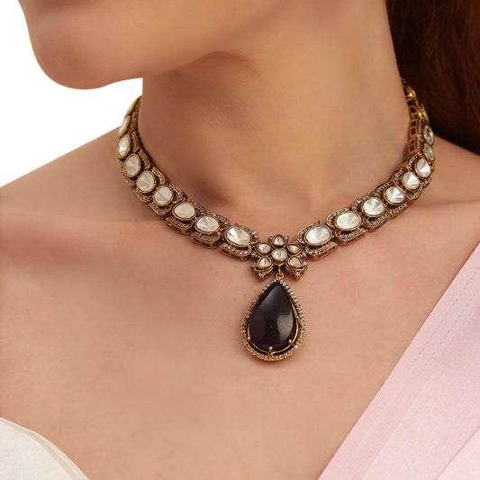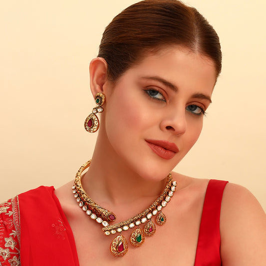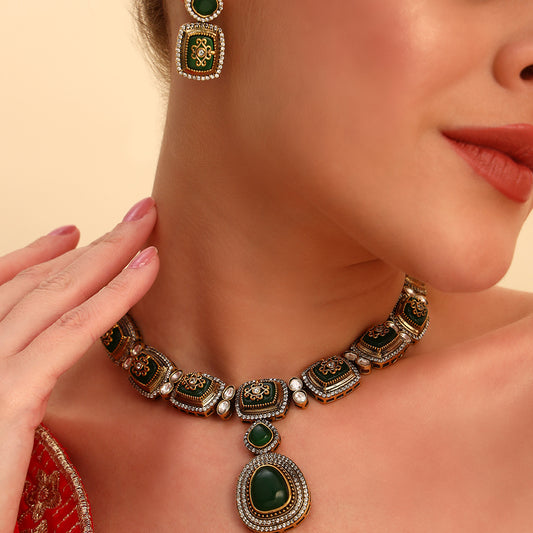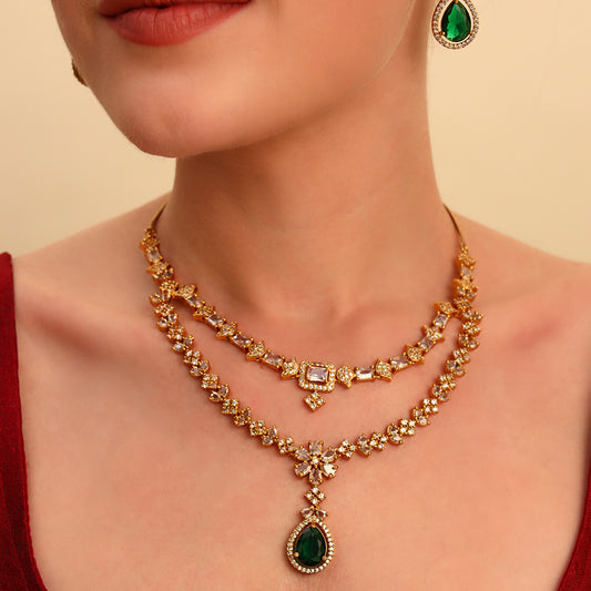 Premium Double Layer AD Necklace Set with Green Stone Pendant