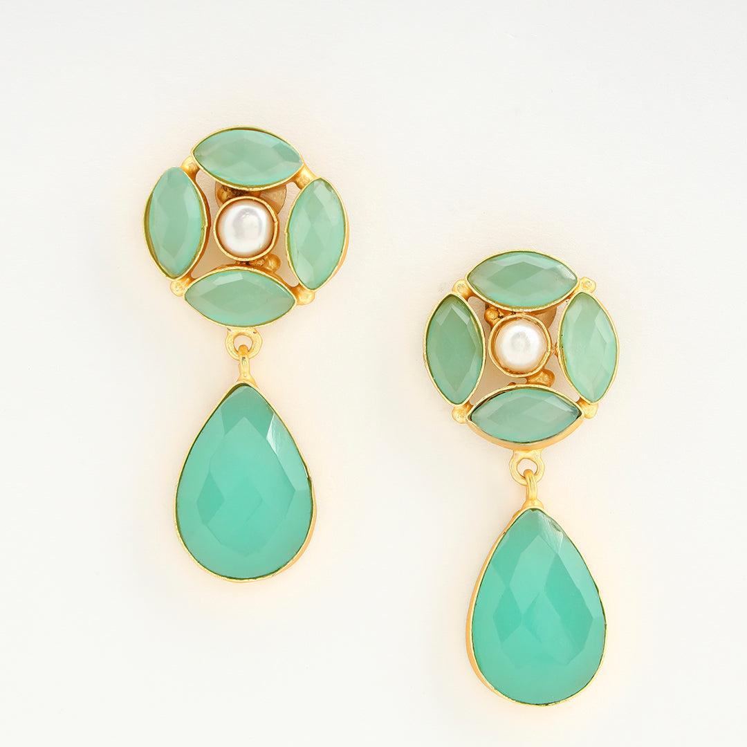 Add a fresh pop of color with these mint green Monalisa stone earrings, featuring a faceted teardrop and pearl center. Lightweight and elegant, perfect for day-to-night looks.
