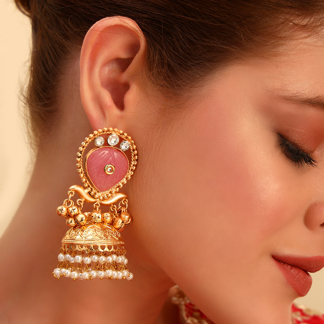 Add a touch of tradition with Lekhavi’s gold-plated long jhumki earrings, featuring a matte pink onyx stone, delicate pearl drops, and timeless handcrafted detailing — a statement piece that blends vintage charm with modern elegance.