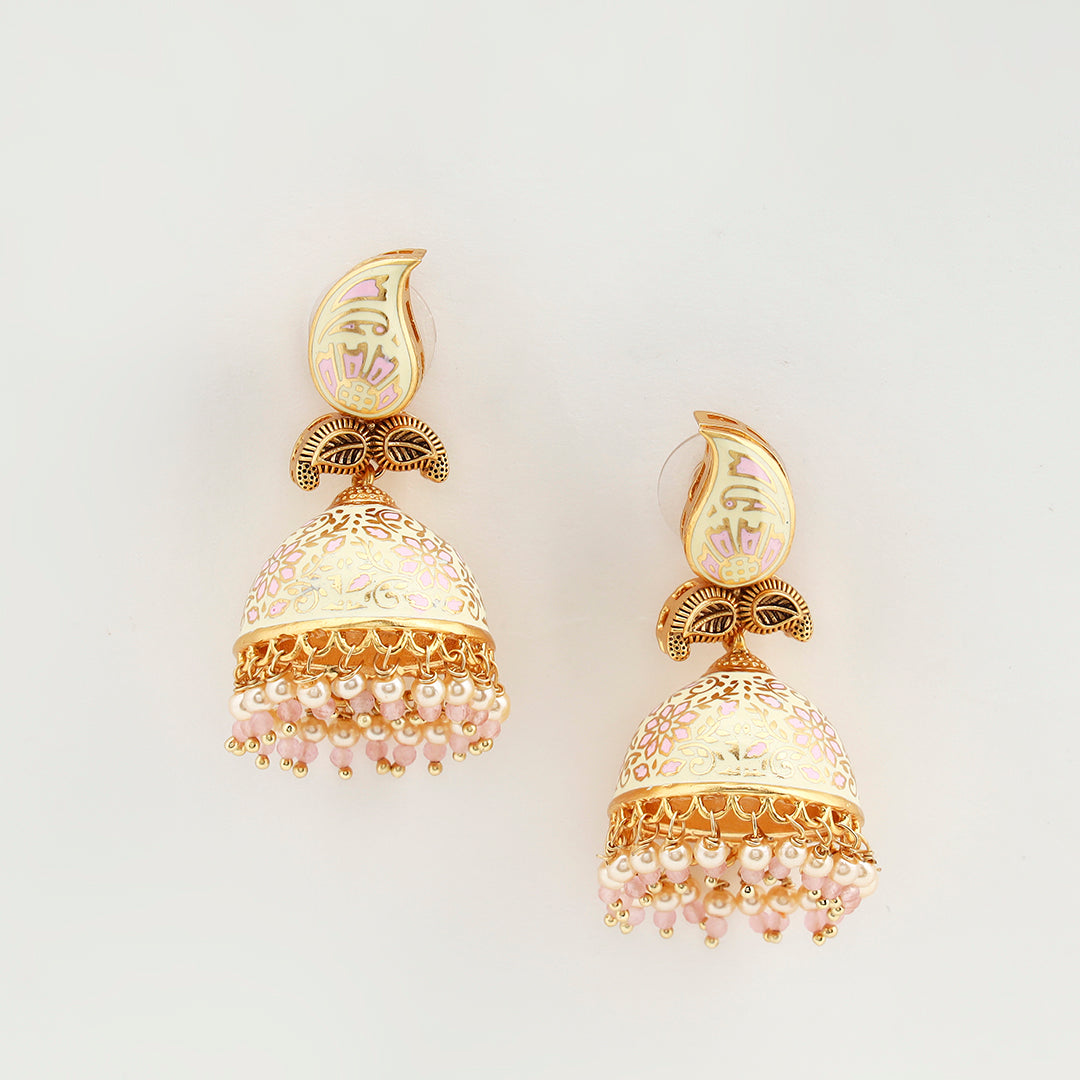 Elegant and timeless, these pink and gold enamel jhumki earrings feature delicate floral detailing and soft pearl drops. The intricate design adds a graceful touch to any festive or traditional outfit.