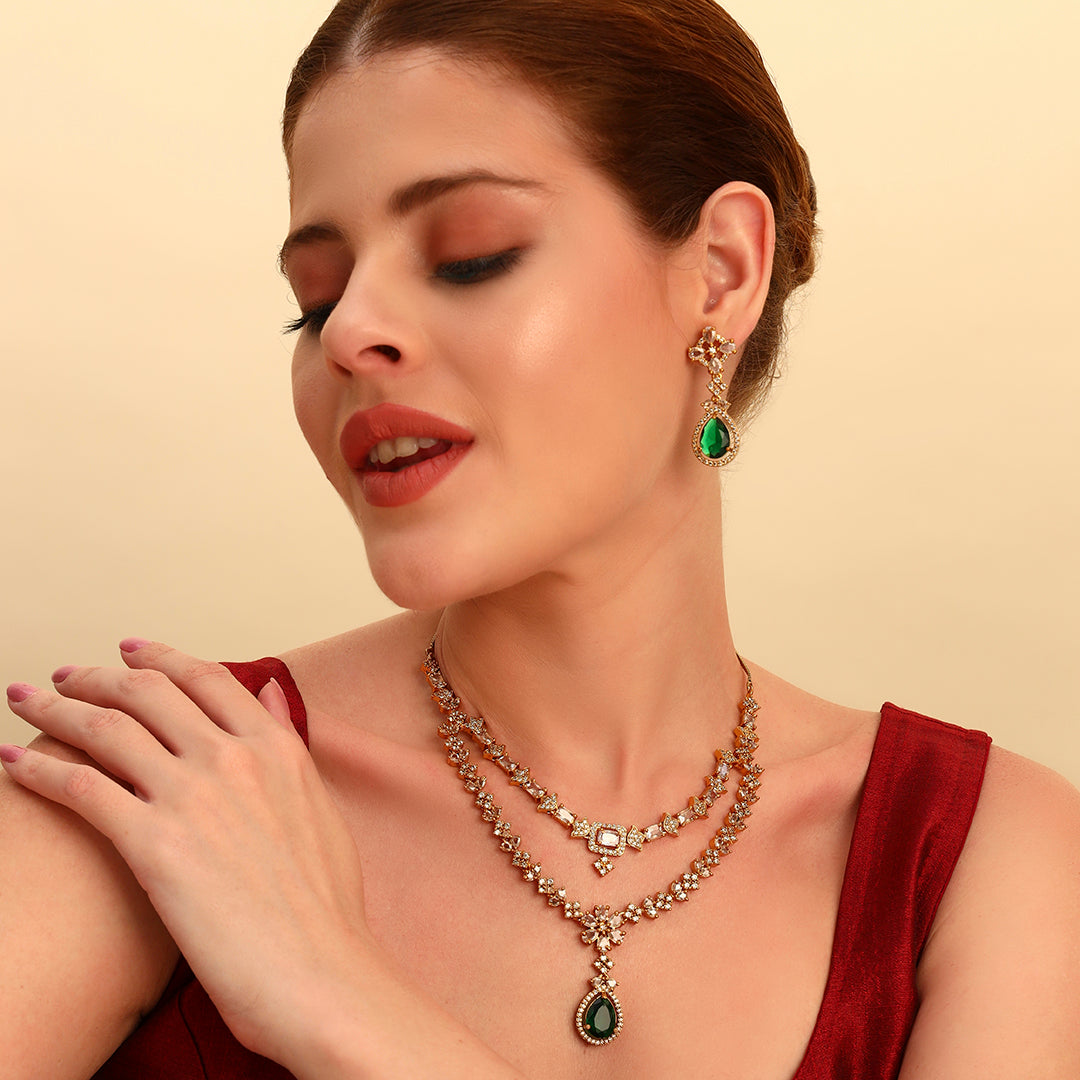 Premium Double Layer AD Necklace Set with Green Stone Pendant