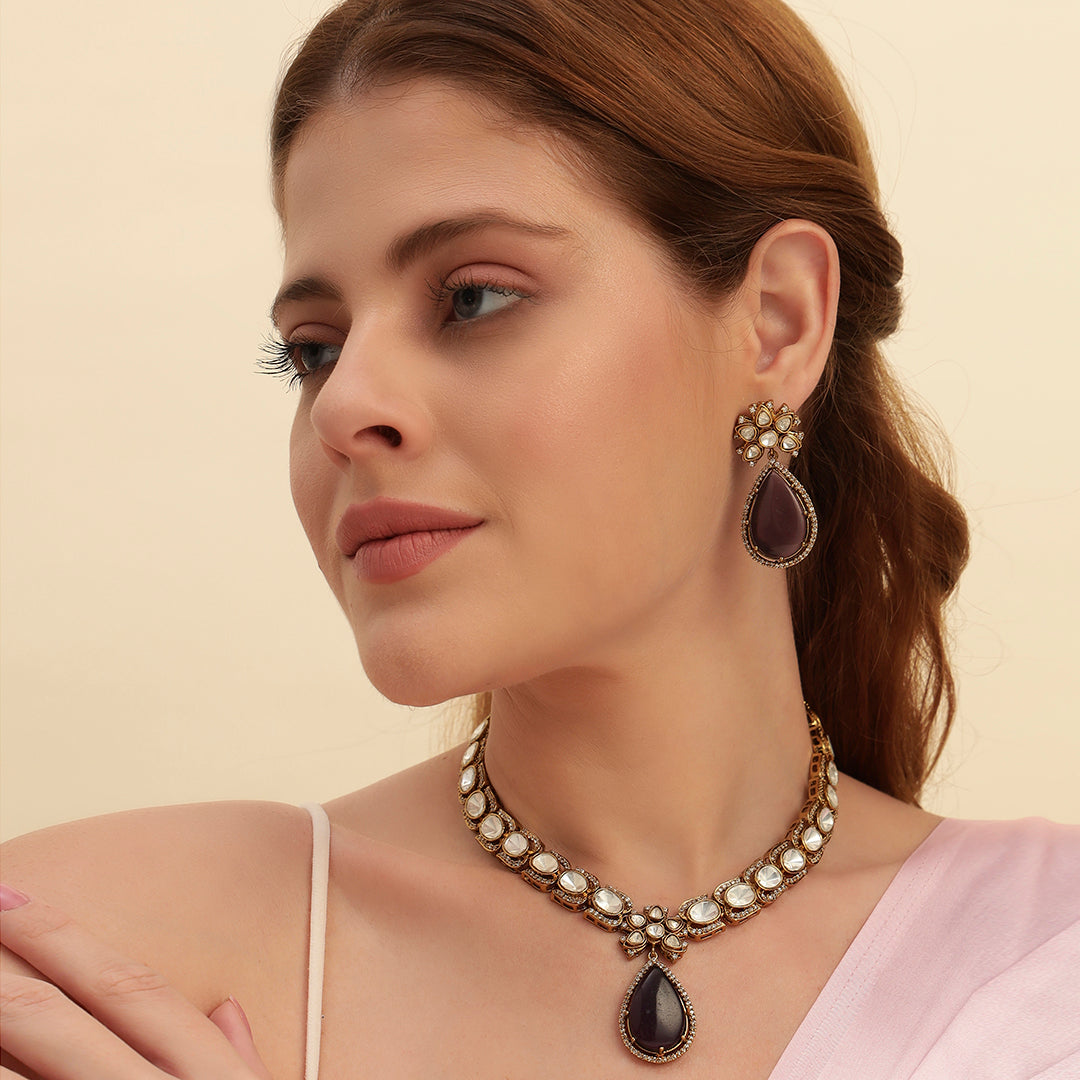 The Royal Kundan Antique Necklace Set exudes timeless elegance with its intricate craftsmanship and regal finish. A refined choice for grand celebrations and sophisticated style.